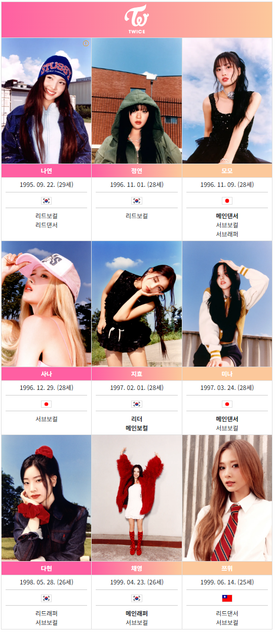 애칭은 '트둥이'로, TWICE와 막둥이의 합성어이다.[13] 데뷔 당시 JYP의 막내 그룹이라는 의미로 붙은 애칭이다.