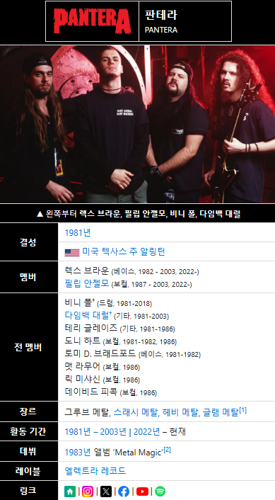 미국의 텍사스주에서 1981년 결성된 4인조 메탈 밴드.[4] 판테라는 초기에는 당대 주류였던 글램메탈 경향을 따랐으나, 곧 독자적인 음악적 정체성을 확립하며 헤비메탈의 새로운 패러다임을 제시했다. 특히 1990년대 초, 드림시어터와 함께 헤비메탈 음악계의 지형을 변화시키고, 그루브 메탈이라는 혁신적인 장르를 개척한 선구자로 평가받는다.