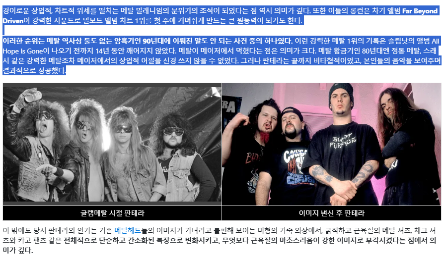 판테라는 초기에는 스스로도 인정할 만큼 전형적인 글램 메탈 밴드였지만, 급진적인 음악적 변혁을 통해 강렬한 그루브와 독특한 음색을 특징으로 하는 새로운 사운드를 선보였다. 이는 미국 헤비메탈 씬에 일대 혁신을 가져왔으며, 그루브 메탈을 주류 음악으로 끌어올리며 헤비메탈 역사상 가장 성공적인 밴드 중 하나로 자리매김하는 계기가 되었다.[5]